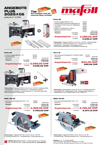 MKS 185 EC MKS 130 ECErika 85Erika 85PS 2-18G%u00fcltigkeit: 01.10. - 31.12.2025 | 08/2025Irrtum, %u00c4nderungen und Druckfehler vorbehalten | LG_CH-DE Alle Preise in CHF gem. PBV g%u00fcltig f%u00fcr gewerbliche Kunden, exkl. vRG. g%u00fcltig in der SchweizMAFELL AG %u00b7 Beffendorfer Str. 4 %u00b7 78727 Oberndorf a.N. %u00b7 GermanyTel. +49 7423 812-281 %u00b7 E-Mail: export@mafell.de %u00b7 www.mafell.chANGEBOTEPLUS2025#05g%u00fcltig bis 31.12.20251 Unterflur-Zugs%u00e4ge ERIKA 85 - CH* 9719201 Parallelanschlag 207506Preisvorteil 1P0174 567,60 CHF Paketpreis ohne MwSt. 3.866,60 CHF mit MwSt. 4.179,79 CHFAngebotspreis ohne MwSt. 3.299,00 CHFmit MwSt. 3.566,22 CHF*Lieferumfang: 1 S%u00e4geblatt-HM 250 x 2,8 x 30 mm, Z 40, WZ; 1 Anbausatz R%u00e4der 1 Schiebestock; 1 Sechskantschl%u00fcssel 6 mm; 1 Absaugset mit 2 Stutzen1 Klemmst%u00fcck; 1 Quickstand; 1 Anschlussleitung 4 m; 1 Multifunktionsanschlag MFA mit zuschaltbarer Winkelrastung1 Zimmerei-Handkreiss%u00e4ge MKS 185 Ec - CH* 924820Preisvorteil 1P0398 935,00 CHF Paketpreis ohne MwSt. 5.334,00 CHF mit MwSt. 5.766,05 CHFAngebotspreis ohne MwSt. 4.399,00 CHFmit MwSt. 4.755,32 CHF*Lieferumfang: 1 S%u00e4geblatt-HM 450 x 2,5/4,2 x 30 mm, Z 20, WZ1 Sechskantschl%u00fcssel 6 mm; 1 Parallelanschlag; 1 Anschlussleitung 10 m*Lieferumfang: 1 S%u00e4geblatt-HM 250 x 2,8 x 30 mm, Z 40, WZ; 1 Anbausatz R%u00e4der 1 Schiebestock; 1 Sechskantschl%u00fcssel 6 mm; 1 Absaugset mit 2 Stutzen1 Klemmst%u00fcck; 1 Quickstand; 1 Anschlussleitung 4 m 1 Multifunktionsanschlag MFA mit zuschaltbarer Winkelrastung1 Unterflur-Zugs%u00e4ge ERIKA 85 - CH* 9719201 Schiebeschlitten maximale Schnittl%u00e4nge 905 mm 0385631 Anschlaglineal 1.000 mm lang, inkl. Abl%u00e4ngklappe 2033961 Zusatztisch 2084392 Auflage- und Halteschiene 1.000 mm 0386861 Sp%u00e4nesammelsystem Cleanbox 203402Preisvorteil 1P0272 632,40 CHF Paketpreis ohne MwSt. 4.921,40 CHF mit MwSt. 5.320,03 CHFAngebotspreis ohne MwSt. 4.289,00 CHFmit MwSt. 4.636,41 CHF1 Zimmerei-Handkreiss%u00e4ge MKS 130 Ec - CH* 925420Preisvorteil 1P0230 590,00 CHF Paketpreis ohne MwSt. 2.789,00 CHF mit MwSt. 3.014,91 CHFAngebotspreis ohne MwSt. 2.199,00 CHFmit MwSt. 2.377,12 CHF*Lieferumfang: 1 S%u00e4geblatt-HM 330 x 2,2/3,2 x 30 mm, Z 24, WZ1 Parallelanschlag; 1 Sechskantschl%u00fcssel 6 mm; 1 Anschlussleitung 10 m1 Akku-Performance-Stichs%u00e4ge PS 2-18 PURE im MAX3* 91C102Preisvorteil 1P0475 55,00 CHF Paketpreis ohne MwSt. 659,00 CHF mit MwSt. 712,38 CHFAngebotspreis ohne MwSt. 604,00 CHFmit MwSt. 652,92 CHF*Lieferumfang: 3 Stichs%u00e4gebl%u00e4tter CUnex W1, W2, W7; 1 Parallelanschlag P-PA1 Grundplatte P-GP; 1 Absaugstutzen P-AS; 1 Absaugstutzenverl%u00e4ngerung1 Sp%u00e4neabweiser P-SA; 5 Spanrei%u00dfschutz P-SS; 1 Gleiter P-G