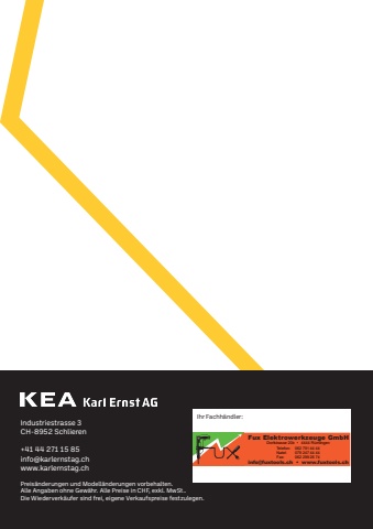 Ihr Fachh%u00e4ndler:Industriestrasse 3CH-8952 Schlieren+41 44 271 15 85info@karlernstag.chwww.karlernstag.chPreis%u00e4nderungen und Modell%u00e4nderungen vorbehalten. Alle Angaben ohne Gew%u00e4hr. Alle Preise in CHF, exkl. MwSt..Die Wiederverk%u00e4ufer sind frei, eigene Verkaufspreise festzulegen.Fux Elektrowerkzeuge GmbHinfo@fuxtools.ch %u2022 www.fuxtools.chDorfstrasse 20b %u2022 4444 R%u00fcmlingen062 791 44 44079 247 44 44062 299 26 74Telefon:Natel:Fax: