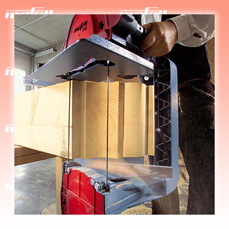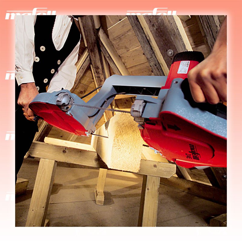 - Mit kugelgelagerten Sägebandführungen für hervorragenden Bandlauf und somit für optimalen Schnitt. Maximal 8 mm-Sägebänder für optimale Flexibilität beim Schweifen und Profilieren von Pfetten und Sparren.