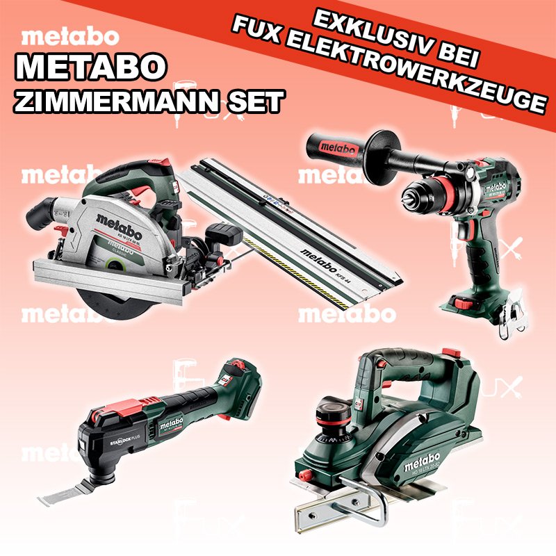 Heute auf dieses Produkt 27% Rabatt! Zu "Zimmermann Set" von Metabo FULL Service: 36 Monate zum Nulltarif für Sie! Weitere Infos zum FULL Service Dieses Produkt ist CAS kompatibel! Weitere Infos zu CAS Black Fuxday Aktionen FUX SPECIAL EXKLUSIV BEI FUX Metabo Zimmermann SET 6 SOLO Bestell- und Artikelnummer: Zimmermann SET 6 SOLO BS 18 LTX BL Q I Akku-BohrschrauberAkkuspannung 18 V Drehzahl 0-550 / 0-2000 U/min Drehmoment hart / weich 130 / 65 Nm Gewicht (mit Akkupack) 2.3 kgInfos MT 18 LTX BL QSL Akku-Multitool Akkuspannung 18 V Schwingzahl bei Leerlauf 8.000 - 20.000 /min Schleifplatte, Maß Eck zu Eck 93 mm Gewicht 1.7 kgInfos HO 18 LTX 20-82 Akku-Einhand-HobelAkkuspannung 18 V Hobelbreite 82 mm Spanabnahme einstellbar 0-2 mm Gewicht 3.5 KgInfos KS 18 LTX 66 BL Akku HandkreissägeAkkuspannung 18 V Schnitt-Tiefe bei 90° 0-66 mm Sägeblatt 165 mm Gewicht 4.5 kgInfos Kappschiene KFS 44Gesamtlänge 834 mm Schnittlänge 440 mmInfos Ergattere dir einen Akku bei der Registration auf metabo.ch Alle Produkte dieser Aktion anzeigen OHNE AKKUS UND LADEGERÄT Standard-Ausrüstung In diesem Set enthalten: BS 18 LTX BL Q I Akku-Bohrschrauber MT 18 LTX BL QSL Akku-Multitool HO 18 LTX 20-82 Akku-Einhand-Hobel KS 18 LTX 66 BL Akku Handkreissäge Kappschiene KFS 44 Listenpreis CHF 1'564.50 Fuxpreis CHF 1'131.00 inkl. 8.1% MwSt, inkl vRG Versand CHF 25.00 Kein Grauimport! Produkt bestellen 1 Stück 2 Stück 3 Stück 4 Stück 5 Stück 6 Stück 7 Stück 8 Stück 9 Stück 10 Stück Alle Angaben ohne Gewähr und solange Vorrat reicht!Wiederverkäufer werden? Produkt als PDF NEUHEITAKTION 27%