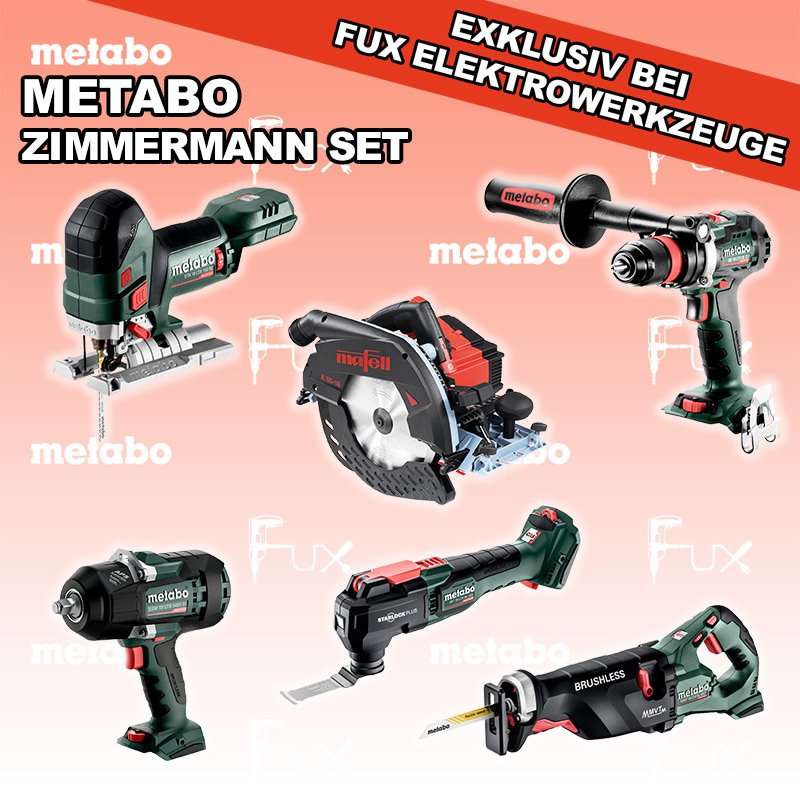 Heute auf dieses Produkt 21% Rabatt! Zu "Zimmermann Set" von Metabo FULL Service: 36 Monate zum Nulltarif für Sie! Weitere Infos zum FULL Service Dieses Produkt ist CAS kompatibel! Weitere Infos zu CAS Black Fuxday Aktionen FUX SPECIAL EXKLUSIV BEI FUX Metabo Zimmermann SET 14 SOLO Bestell- und Artikelnummer: Zimmermann SET 14 SOLO BS 18 LTX BL Q I Akku-BohrschrauberAkkuspannung 18 V Drehzahl 0-550 / 0-2000 U/min Drehmoment hart / weich 130 / 65 Nm Gewicht (mit Akkupack) 2.3 kgInfos SSW 18 LTX 1450 BL Akku-SchlagschrauberAkkuspannung 18 V Anziehdrehmoment 1450 Nm Werkzeugaufnahme 1/2" Infos SSEP 18 LTX BL MVT Akku-SäbelsägeAkkuspannung 18 V Hubzahl bei Leerlauf 0 - 3.000 /min Gewicht (mit Akkupack) 4.6 kgInfos K 85 - 18 PURE Akku-Handkreissägen im L-MAXSchnitttiefe 0 – 88 mm Schnitttiefe bei 45° 0 – 61.5 mm Gewicht (mit Akku) 8.1 kgInfos MT 18 LTX BL QSL Akku-Multitool Akkuspannung 18 V Schwingzahl bei Leerlauf 8.000 - 20.000 /min Schleifplatte, Maß Eck zu Eck 93 mm Gewicht 1.7 kgInfos STA 18 LTX 150 BL Akku-StichsägeAkkuspannung 18 V Hubzahl 1.000-3.500 /min Gewicht ohne Akkupack 1.9 kgInfos Registriere die in diesem Set vorhandenen Metabo Maschinen auf metabo.ch, und ergattere dir bis zu 5 Gratis Akkus!Zusätzlich offerieren wir zu diesem Set einen Gratis Akku!OHNE AKKUS UND LADEGERÄT Standard-Ausrüstung In diesem Set enthalten: BS 18 LTX BL Q I Akku-Bohrschrauber SSW 18 LTX 1450 BL Akku-Schlagschrauber SSEP 18 LTX BL MVT Akku-Säbelsäge K 85 - 18 PURE Akku-Handkreissägen im L-MAX MT 18 LTX BL QSL Akku-Multitool STA 18 LTX 150 BL Akku-Stichsäge Listenpreis CHF 3'161.20 Fuxpreis CHF 2'497.00 inkl. 8.1% MwSt, inkl vRG Versand CHF 25.00 Kein Grauimport! Produkt bestellen 1 Stück 2 Stück 3 Stück 4 Stück 5 Stück 6 Stück 7 Stück 8 Stück 9 Stück 10 Stück Alle Angaben ohne Gewähr und solange Vorrat reicht!Wiederverkäufer werden? Produkt als PDF NEUHEITAKTION 21%