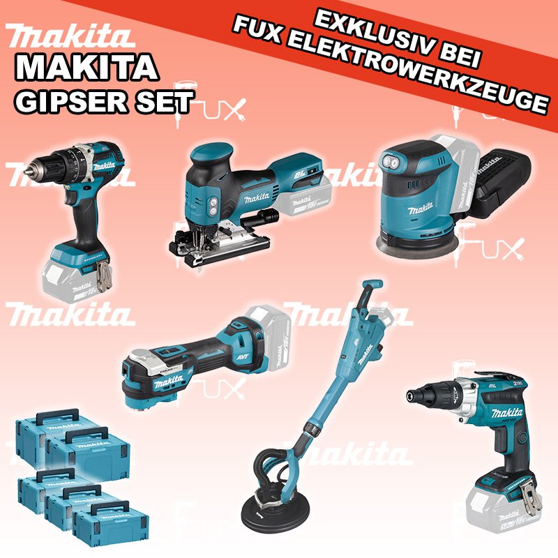 Das Ladenlokal bleibt vom 25. Dezember 2025 bis am 04. Januar 2026 geschlossen. Bestellungen und Lieferungen von Neugeräten werden trotz Ferienabwesenheit in gewohnter Fux-Manier entgegengenommen und ausgeliefert. Zu "Gipser Set" von Makita FUX SPECIAL EXKLUSIV BEI FUX Makita Gipser Set 12 SOLO Bestell- und Artikelnummer: maGipser Set 12 SOLO DHP484ZJ Akku-SchlagbohrschrauberAkkuspannung 18 V Drehzahlen 0-500 / 0-2000 U/min Drehmoment hart / weich 54 / 30 Nm Gewicht 1.6 kgInfos DFS251ZJ Akku-SchrauberAkkuspannung 18 V Drehzahl 0-2500 U/min Werkzeugaufnahme 1/4" (Innensechskant) Gewicht 1.5 kgInfos DSL801ZU Akku-LanghalsschleiferAkkuspannung 18 V Papierdurchmesser 225 mm Verstellbares Teleskoprohr mit 420 mm Spielraum Gewicht 5.8 kgInfos DBO180ZJ Akku-ExzenterschleiferAkkuspannung 18 V Exzenterhub 2,8 mm Schleifteller (Ø) 125 mm Gewicht 3.6 kgInfos DTM52Z Multifunktions WerkzeugAkkuspannung 18 V Schwingungen 10000 - 20000 min-1 Werkzeugaufnahme Starlock Max System Gewicht inkl. Akku 2.0 kg Infos DJV18ZJ Akku-StichsägeAkkuspannung 18 V Hubzahl 800 - 3500/ min Schnittleistung Holz 135 mm / Stahl 10 mm Gewicht 2.5 kgInfos MAKPAC Gr. 3Produktabmessung (L x B x H) 377 x 277 x 176 mm Infos Einsatz für DTM52 Einsatz für DTM52 Makpac Koffer Typ C (821551-8) Infos OHNE AKKUS UND LADEGERÄT Standard-Ausrüstung In diesem Set enthalten: DHP484ZJ Akku-Schlagbohrschrauber DFS251ZJ Akku-Schrauber DSL801ZU Akku-Langhalsschleifer DBO180ZJ Akku-Exzenterschleifer DTM52Z Multifunktions Werkzeug DJV18ZJ Akku-Stichsäge MAKPAC Gr. 3 Einsatz für DTM52 Geliefert im Koffer Zubehör Listenpreis CHF 2'056.00 Fuxpreis CHF 1'387.00 inkl. 8.1% MwSt, inkl vRG Versand CHF 20.00 Kein Grauimport! Produkt bestellen 1 Stück 2 Stück 3 Stück 4 Stück 5 Stück 6 Stück 7 Stück 8 Stück 9 Stück 10 Stück Option: Makita BL 1860 B ( Li-lon Akku ) für CHF 95.- statt CHF 124.-Infos Alle Angaben ohne Gewähr und solange Vorrat reicht!Wiederverkäufer werden? Produkt als PDF NEUHEITAKTION 32%
