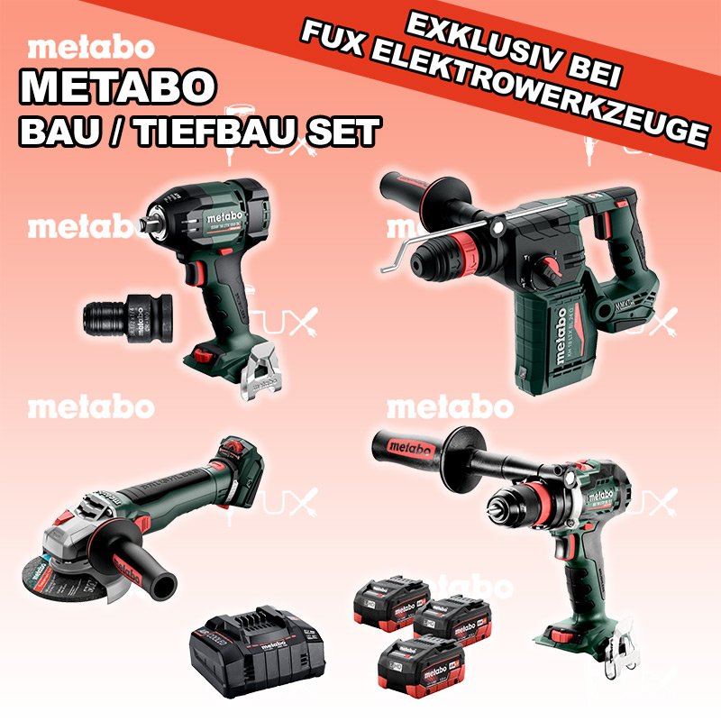 Das Ladenlokal bleibt vom 25. Dezember 2025 bis am 04. Januar 2026 geschlossen. Bestellungen und Lieferungen von Neugeräten werden trotz Ferienabwesenheit in gewohnter Fux-Manier entgegengenommen und ausgeliefert. Zu "Bau / Tiefbau Set" von Metabo FULL Service: 36 Monate zum Nulltarif für Sie! Weitere Infos zum FULL Service FUX SPECIAL EXKLUSIV BEI FUX Metabo Bau / Tiefbau Set 7 Bestell- und Artikelnummer: Bau / Tiefbau Set 7 BS 18 LTX BL Q I Akku-BohrschrauberAkkuspannung 18 V Drehzahl 0-550 / 0-2000 U/min Drehmoment hart / weich 130 / 65 Nm Gewicht (mit Akkupack) 2.3 kgInfos KH 18 LTX BL 24 Q Akku-KombihammerAkkuspannung 18 V Einzelschlagstärke 2.2 J Bohrleistung in Beton 24 mm Gewicht ohne Akkupack 3 kgInfos WVB 18 LT BL 11-125 Quick Akku-WinkelschleiferAkkuspannung 18 V Drehzahl 2.800 - 10.000 / min Ø 125 mm Scheiben Gewicht (mit Akkupack) 2.5 kgInfos SSW 18 LTX 550 BL Akku-SchlagschrauberAkkuspannung 18 V Anziehdrehmoment 550 Nm Werkzeugaufnahme 1/2" Gewicht ohne Akkupack 1,4 kgInfos 3 x 18 V, 5.5 Ah, LiHD Akkupack18 V 5.5 Ah ( LiHD Akkus ) Infos ASC 145, 12 - 36 V "Air Cooled" LadegerätZum Aufladen aller Li-Power Schiebesitz-Akkupacks (12 V - 36 V). Ladestrom 8.0 AInfos Adapter mit 1/2“ auf 1/4"Adapter mit 1/2“ Innenvierkant maschinenseitig und 1/4“ Innensechskant für schlagfeste Einsatzwerkzeuge mit 1/4“ SchaftInfos Registriere die in diesem Set vorhandenen Metabo Maschinen auf metabo.ch, und ergattere dir bis zu 5 Gratis Akkus!Zusätzlich offerieren wir zu diesem Set einen Gratis Akku! Standard-Ausrüstung In diesem Set enthalten: BS 18 LTX BL Q I Akku-Bohrschrauber KH 18 LTX BL 24 Q Akku-Kombihammer WVB 18 LT BL 11-125 Quick Akku-Winkelschleifer SSW 18 LTX 550 BL Akku-Schlagschrauber 3 x 18 V, 5.5 Ah, LiHD Akkupack ASC 145, 12 - 36 V "Air Cooled" Ladegerät Adapter mit 1/2“ auf 1/4" Listenpreis CHF 1'863.00 Fuxpreis CHF 1'273.00 inkl. 8.1% MwSt, inkl vRG Frankolieferung Kein Grauimport! Produkt bestellen 1 Stück 2 Stück 3 Stück 4 Stück 5 Stück 6 Stück 7 Stück 8 Stück 9 Stück 10 Stück Alle Angaben ohne Gewähr und solange Vorrat reicht!Wiederverkäufer werden? Produkt als PDF NEUHEITAKTION 31%