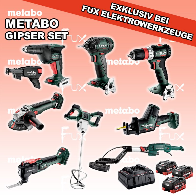Zu "Gipser Set" von Metabo FUX SPECIAL EXKLUSIV BEI FUX Metabo Gipser Set 9 Bestell- und Artikelnummer: Gipser Set 9 FULL Service: 36 Monate zum Nulltarif für Sie! Weitere Infos zum FULL Service BS 18 L BL Q Akku-BohrschrauberAkkuspannung 18 V Drehzahl 0 - 500 / 0 - 1700 /min Drehmoment hart / weich 60 / 28 Nm Gewicht (mit Akkupack) 1.3 kgInfos TBS 18 LTX BL 5000 Akku-TrockenbauschrauberAkkuspannung 18 V Leerlaufdrehzahl 0 - 5.000 /min Max. Drehmoment weich 6 Nm Gewicht mit Akkupack 1,3 kgInfos RW 18 LTX BL 140-2 Akku-RührwerkAkkuspannung 18 V Max. Rührkorb-Durchmesser 140 mm Max. empfohlene Mischmenge 50 l Werkzeugaufnahme Innengewinde M 14 Infos SSD 18 LTX 200 BL Akku-Schlagschrauber Akkuspannung 18 V Anziehdrehmoment 200 Nm Werkzeugaufnahme 1/4" Gewicht 1.3 kgInfos WVB 18 LT BL 11-125 Quick Akku-WinkelschleiferAkkuspannung 18 V Drehzahl 2.800 - 10.000 / min Ø 125 mm Scheiben Gewicht (mit Akkupack) 2.5 kgInfos SSE 18 LTX BL Compact Akku-SäbelsägeAkkuspannung 18 V Hubzahl 0-3000 min-1 Hublängen 16 mm Gewicht (mit Akkupack) 1.8 kgInfos MT 18 LTX BL QSL Akku-Multitool Akkuspannung 18 V Schwingzahl bei Leerlauf 8.000 - 20.000 /min Schleifplatte, Maß Eck zu Eck 93 mm Gewicht 1.7 kgInfos LSV 5-225 Comfort LanghalsschleiferLeistungsaufnahme 500 Watt Durchmesser Schleifteller 225 mm Leerlaufdrehzahl 1000 - 1650 min-1 Gewicht 4.5 kgInfos 3 x 18 V, 5.5 Ah, LiHD Akkupack18 V 5.5 Ah ( LiHD Akkus ) Infos ASC 145, 12 - 36 V "Air Cooled" LadegerätZum Aufladen aller Li-Power Schiebesitz-Akkupacks (12 V - 36 V). Ladestrom 8.0 AInfos Schrauber-Magazin Speed Fix 57Robustes Schrauber-Magazin geeignet für TBS 18 LTX 5000 und HBS 18 LTX 3000Infos Registriere die in diesem Set vorhandenen Metabo Maschinen auf metabo.ch, und ergattere dir bis zu 5 Gratis Akkus!Zusätzlich offerieren wir zu diesem Set einen Gratis Akku! Standard-Ausrüstung In diesem Set enthalten: BS 18 L BL Q Akku-Bohrschrauber TBS 18 LTX BL 5000 Akku-Trockenbauschrauber RW 18 LTX BL 140-2 Akku-Rührwerk SSD 18 LTX 200 BL Akku-Schlagschrauber WVB 18 LT BL 11-125 Quick Akku-Winkelschleifer SSE 18 LTX BL Compact Akku-Säbelsäge MT 18 LTX BL QSL Akku-Multitool LSV 5-225 Comfort Langhalsschleifer 3 x 18 V, 5.5 Ah, LiHD Akkupack ASC 145, 12 - 36 V "Air Cooled" Ladegerät Schrauber-Magazin Speed Fix 57 Listenpreis CHF 3'585.50 Fuxpreis CHF 2'441.00 inklusive 8.1% MwSt Frankolieferung Kein Grauimport! Produkt bestellen 1 Stück 2 Stück 3 Stück 4 Stück 5 Stück 6 Stück 7 Stück 8 Stück 9 Stück 10 Stück Alle Angaben ohne Gewähr und solange Vorrat reicht!Wiederverkäufer werden? Produkt als PDF NEUHEITAKTION 31%