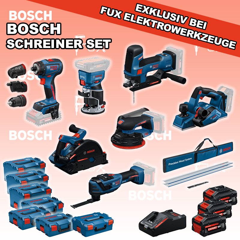 Bosch Expert EXSchreiner Set 11 EXST18V-155S Akku-Stichsäge EXSR18V-90FC Akku-Bohrschrauber GKF 18V-8 Akku-Kantenfräse EXKT18V-52G Akku-Tauchsäge GHO 18V-26 Akku-Einhandhobel EXOP18V-40 Akku-Multi-Cutter EXEX18V-150-5 Akku-Exzenterschleifer FSN 1400 Set Führungsschienensysteme Systemzubehör 3x EXBA18V-80 + EXAL18V-160 Starter-Set