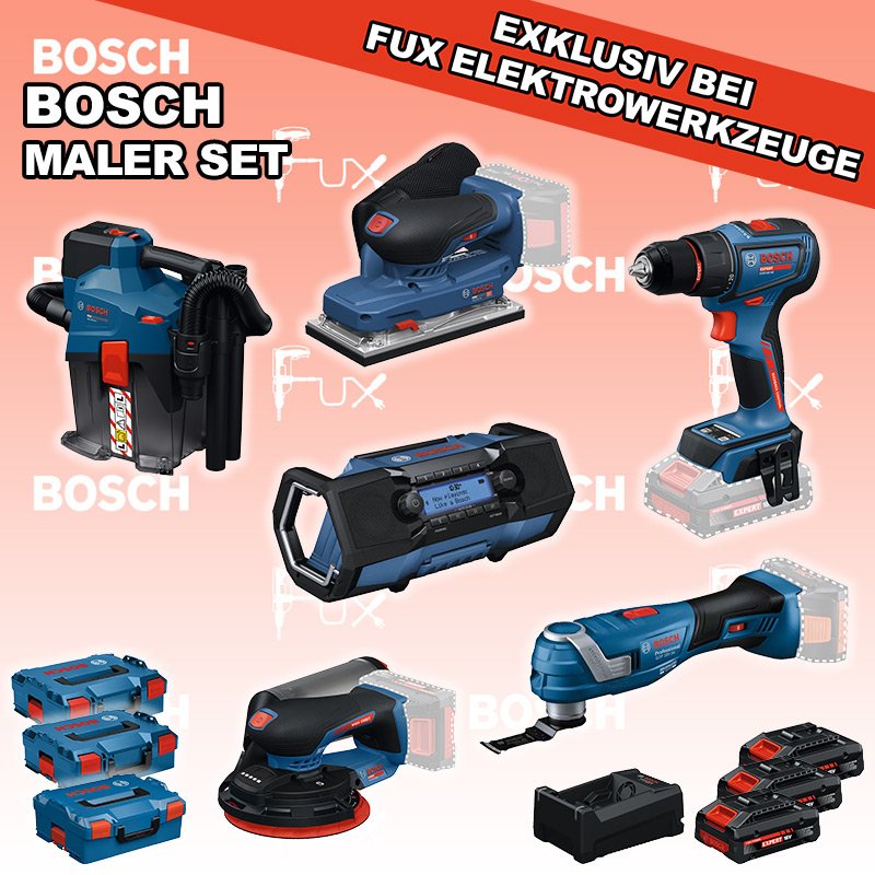 Zu "Maler Set" von Bosch Professional FUX SPECIAL EXKLUSIV BEI FUX Bosch Professional BOMaler Set 2 Bestell- und Artikelnummer: BOMaler Set 2 EXSR18V-90 Akku-BohrschrauberAkkuspannung 18 V Drehmoment 36 / 65 Nm Leerlaufdrehzahl 0 – 630 / 0 – 2100 min⁻¹ Gewicht exkl. Akku 1.1 kgInfos GAS18V-6LS Akku-StaubsaugerAkkuspannung 18 V Behältervolumen netto 4.5 l Staubklasse L Gewicht exkl. Akku 4 kgInfos EXEX18V-150-5 Akku-ExzenterschleiferAkkuspannung 18 V Schleifteller-Ø 150 mm Leerlaufdrehzahl 5000 – 10000 Umin Schwingzahl 10000 – 20000 min⁻¹ Gewicht exkl. Akku 1.2 kgInfos GSS18V-18 Akku-SchwingschleiferAkkuspannung 18 V Schwingzahl im Leerlauf 11.000 – 22.000 min-1 Schleifplatte 113 x 101 mm Gewicht inkl. Akku 1.7 kgInfos GPB18V-3SC Akku-RadioAkkuspannung 18 V oder USB-C Wiedergabe über DAB+, Bluetooth®, FM Nennleistung je Mitteltöner 10 W Gewicht exkl. Akku 2.1 kgInfos GOP 18V-34 Akku-Multi-CutterAkkuspannung 18 V Leerlaufschwingzahl 20000 min⁻¹ Oszillationswinkel links und rechts 1.7 ° Gewicht exkl. Akku 1.2 KgInfos 3x EXBA18V-40 + GAL 12V/18V-80 Starter-Set3 x EXBA18V-40 Akkupack GAL 12V/18V-80 LadegerätInfos Standard-Ausrüstung In diesem Set enthalten: EXSR18V-90 Akku-Bohrschrauber GAS18V-6LS Akku-Staubsauger EXEX18V-150-5 Akku-Exzenterschleifer GSS18V-18 Akku-Schwingschleifer GPB18V-3SC Akku-Radio GOP 18V-34 Akku-Multi-Cutter 3x EXBA18V-40 + GAL 12V/18V-80 Starter-Set Geliefert im Koffer Zubehör Listenpreis CHF 1'909.80 Fuxpreis CHF 1'451.00 inklusive 8.1% MwSt Kostenloser Versand Kein Grauimport! Produkt bestellen 1 Stück 2 Stück 3 Stück 4 Stück 5 Stück 6 Stück 7 Stück 8 Stück 9 Stück 10 Stück Alle Angaben ohne Gewähr und solange Vorrat reicht! Produkt als PDF AKTION 24%